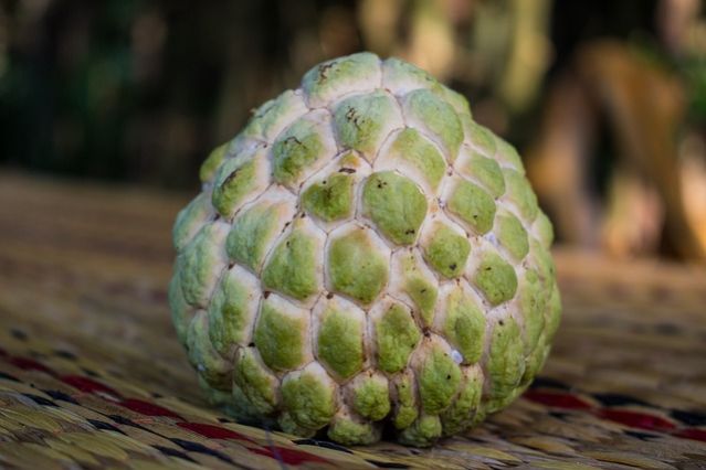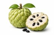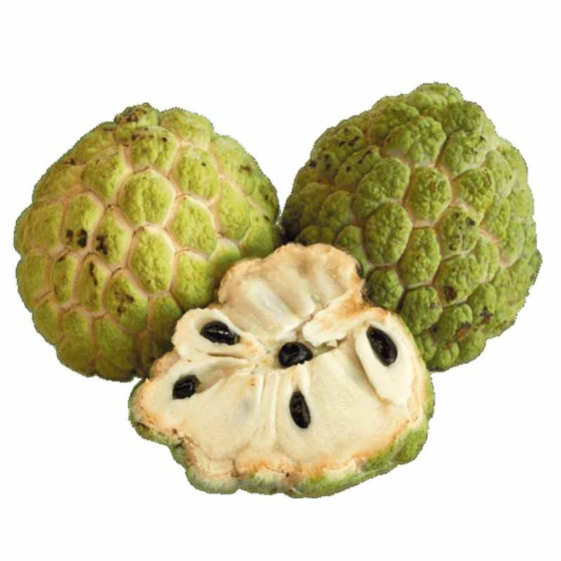* Description: A heart-shaped fruit with a green, scaly, leathery skin. The inside is creamy white flesh with a custard-like texture and embedded black seeds. * Taste: Very sweet, with a flavor reminiscent of vanilla custard or pineapple.