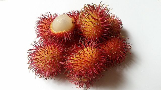 * Description: A tropical fruit looks like a sea urchin with a hairy, red and green spiky rind. Inside is a translucent, juicy flesh surrounding a single seed. * Taste: Sweet and slightly acidic, similar to a lychee or grape.